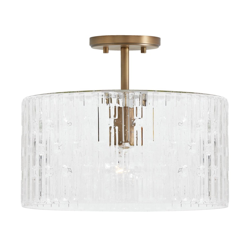 Create a simple and striking statement with the Emerson 1-Light Dual Mount Pendant. This fixture features a wide seeded glass shade with an embossed geometric pattern that sparkles on a clean and classic Aged Brass frame. This fixture can be used as a Semi-Flush or as a Pendant.