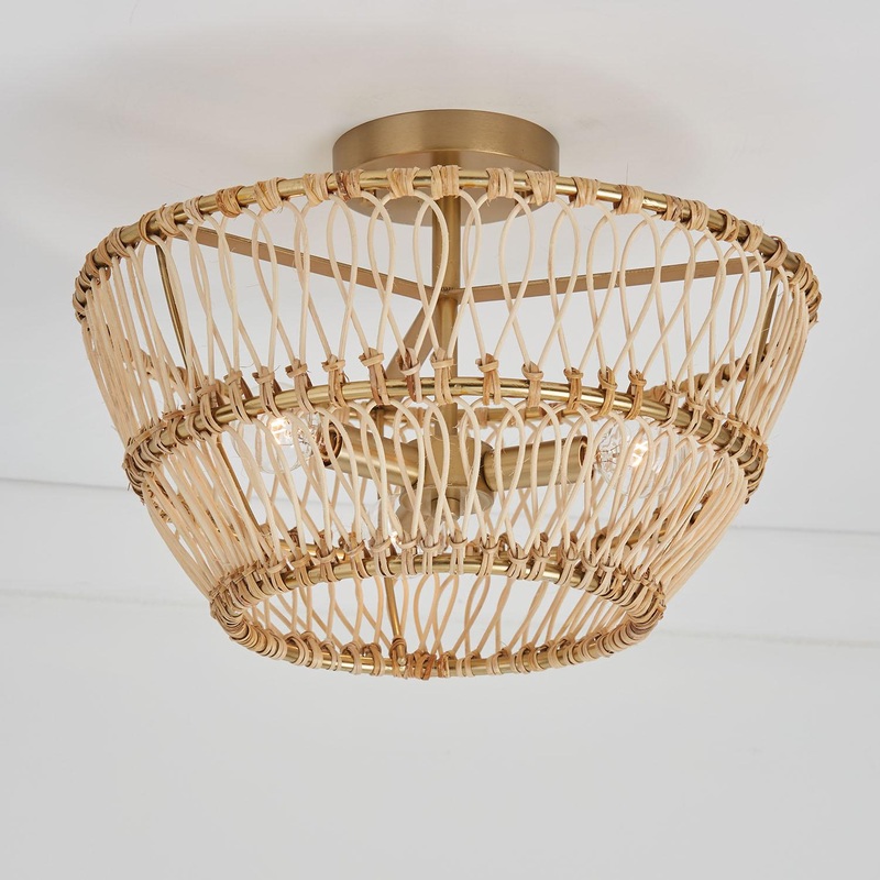 Artisan crafted and organically beautiful the Wren Dual Mount creates sculptural intrigue. Whether hung as a pendant or a semi-flush the Matte Brass finish brings out the natural warmth of the intricately looped rattan for a one-of-a-kind look.