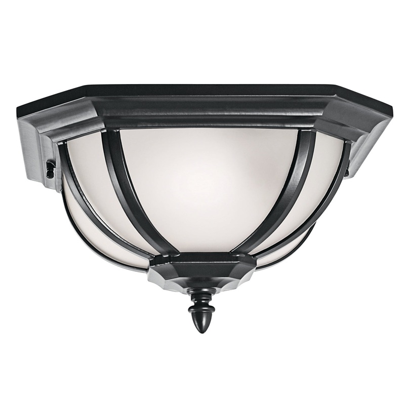 With an unmistakable British influence, this 2 light flush mount ceiling fixture from the elegant Salisbury collection projects timeless style for exterior spaces. Accented with a classic Black finish and White Linen Glass, this piece is as functional as i